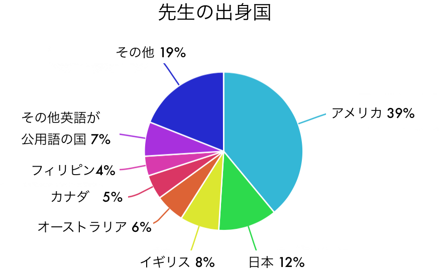 eikaiwaNOWには、世界30カ以上の先生が在籍しています。英語圏、英語が公用語国のネイティブの先生が約70%!そしてeikaiwaNOWの先生の強みは日本在住だということ。日本語がある程度話せたり、日本の文化に慣れている先生が多いんです。他社スカイプ英会話の先生は海外在住だから、同じマンツーマンレッスンでも日本人がよく間違えるポイントを把握していたり、コミュニケーションがしやすいのが強みです。